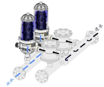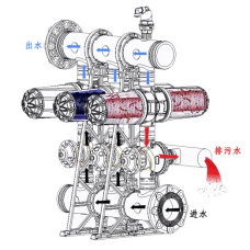反沖洗階段原理:當達到一定的壓差時,或設定的時間內(nèi)系統(tǒng)自動進入反沖洗狀態(tài),控制器控制閥門改變水流方向,過濾器底部隔膜關(guān)閉主通道,反沖洗進入四組噴嘴通道,和噴嘴通道連接的活塞腔內(nèi)的水壓上升,活塞向上運動克服彈簧對疊片的壓力,同時反沖洗水從四組噴嘴通道上面的 30*4 個噴嘴沿疊片切線的方向高速噴射,使疊片旋轉(zhuǎn)并均勻分開,噴洗水噴洗疊片表面,將截留在疊片上的雜質(zhì)噴洗甩出。如下圖
